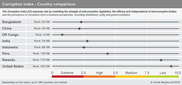 Our Corruption Index assesses ten drivers of corruption to produce a unique score for each country, allowing companies to easily compare their exposure to risks across their countries of operation.