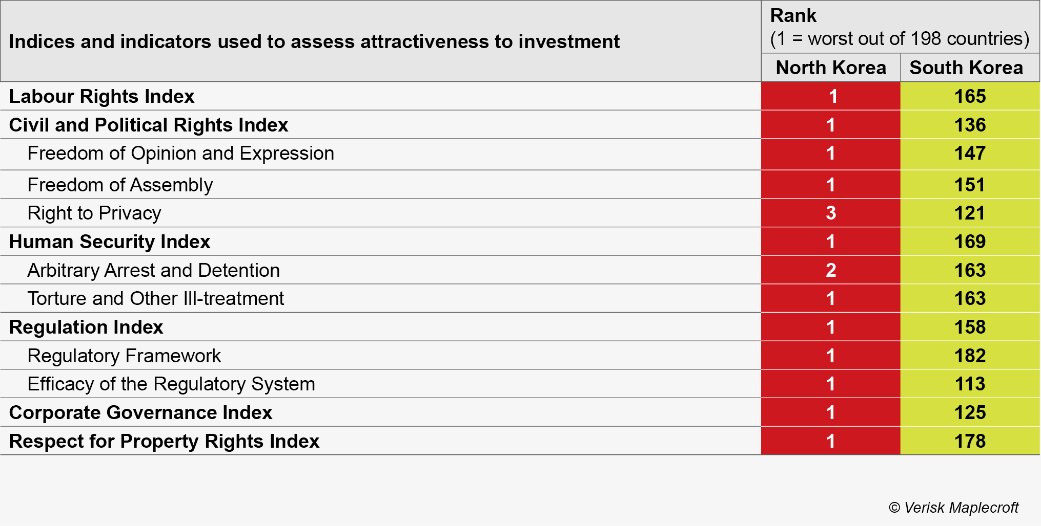 North Korea performs the worst globally on all the chosen indicators of investability, including the most severe forms of human rights violations.