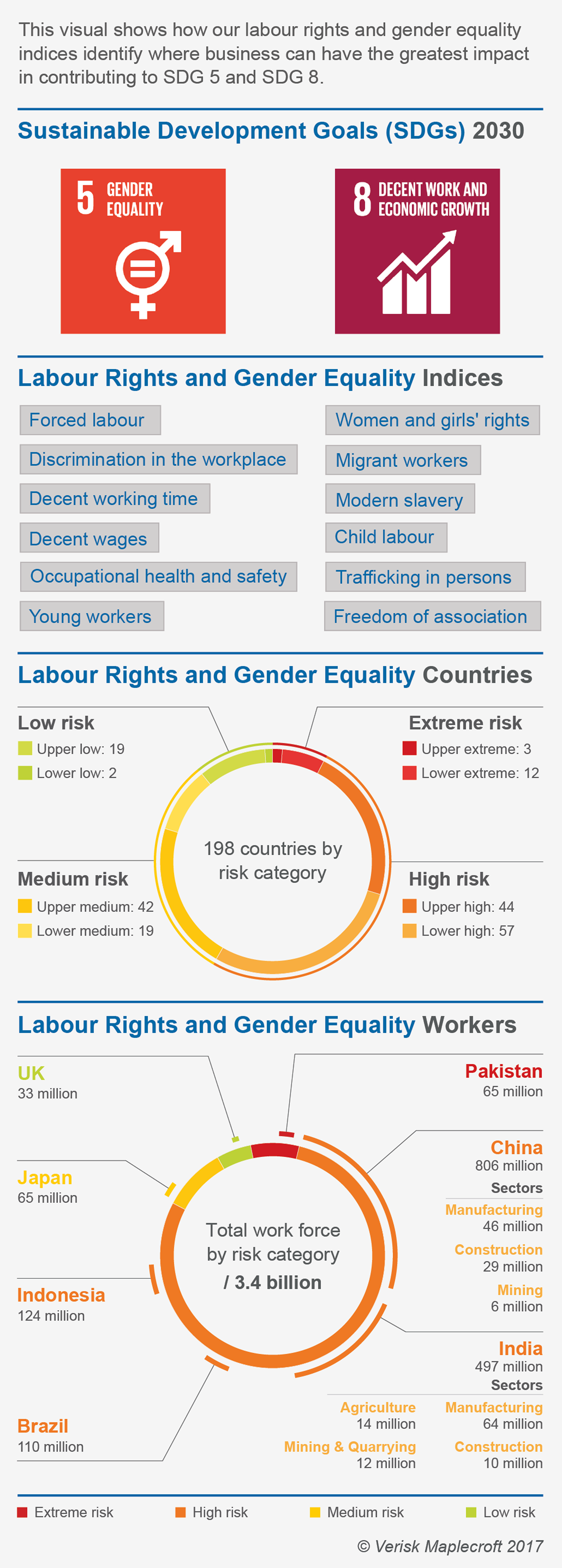 That businesses are engaging more with the SDGs, and with women and girls’ issues more generally, is in line with analysis from our 2017 Human Rights Outlook, which found that the two goals to which business can contribute most directly are SDG 5 and SDG 8. As the figure below shows, approximately 3 billion workers, or 81% of the world’s workforce, are living in countries that are considered to be high or extreme risk for both labour rights violations and gender inequality.